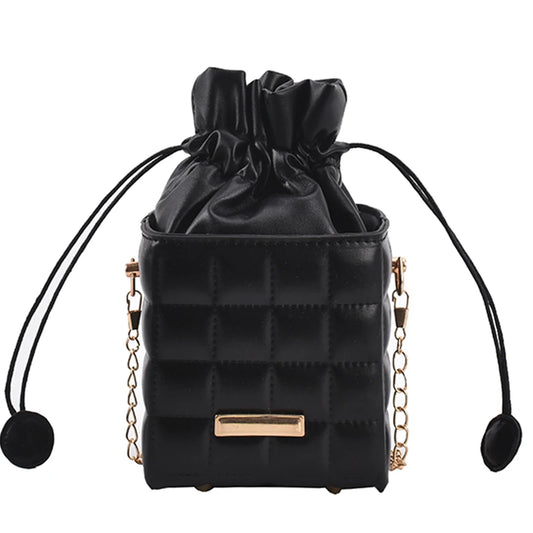 Vintage Checker Chain Cube Messenger Bag Women Drawstring PU Leather Small Purse